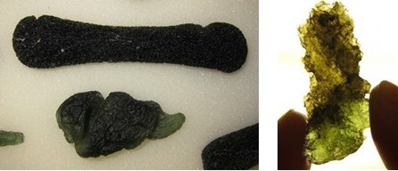ABOVE LEFT: A fine dumbbell and a super super-rare spiral Moldavite. ABOVE RIGHT: A bi-colour Moldavite.