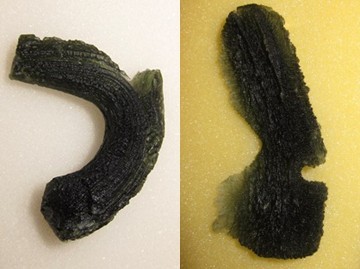 ABOVE LEFT: An arciform Moldavite that has split to become a stretch form - from Slav?e. ABOVE RIGHT: Another stretch Moldavite - and there were at least a couple more very convincing stretch forms in the collection - see the slide shows below.