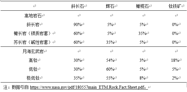 表3 月球高地和月海主要岩石类型的典型矿物含量