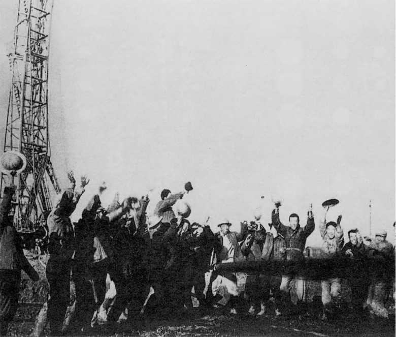 1959年9月26日国庆节前夕,黑龙江松辽盆地三号探井喷出工业油流,就此发现大庆油田,一举为我国摘掉贫油帽子。上图为工人们在现场热烈欢呼。