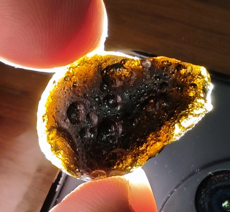 经小心挖掘采出, 原是一颗扁型小水滴状标本,漆黑油亮,个体完整,棱角分明,气印饱满。