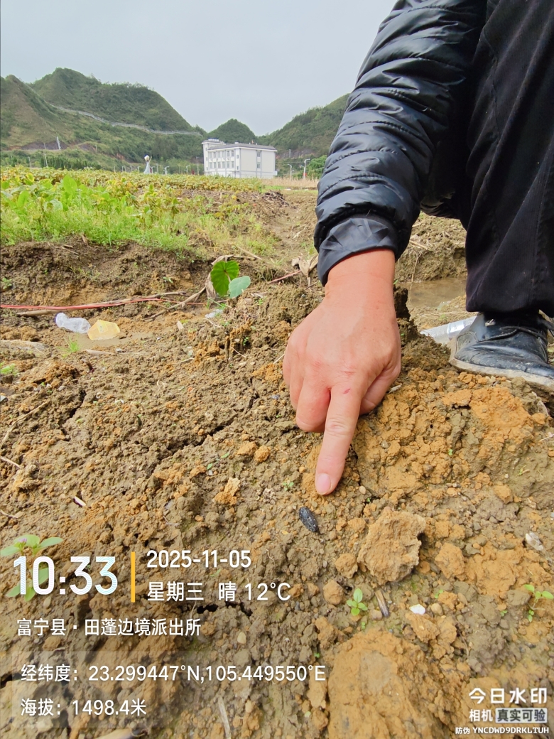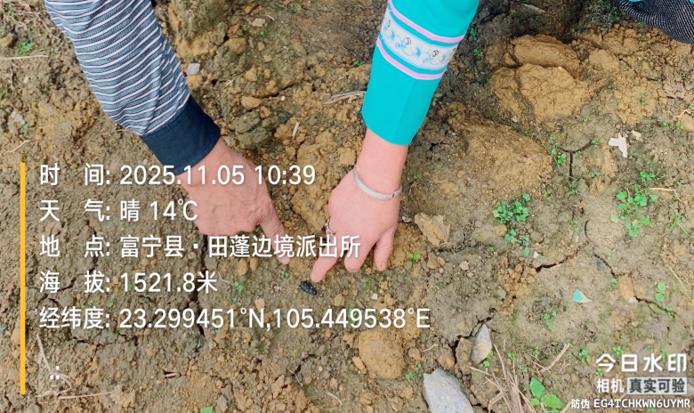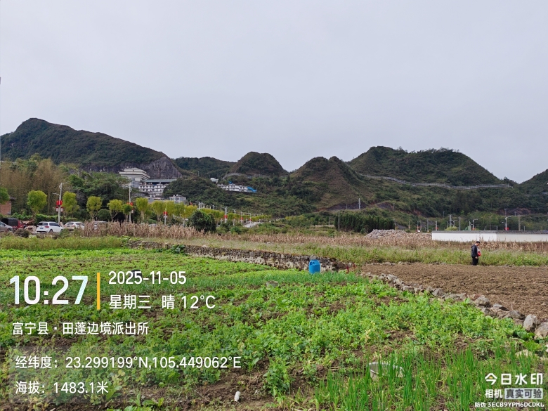 激动之余,赶紧拍照取证,同时采用普通手机相机及装有“今日水印相机”小软件的手机记录珍贵的现场信息,所拍照片上完整记录了拍照的时间、天气、地点、经纬度、海拔等信息。 铭记地点:富宁县田蓬边境派出所,经纬度: N23.2994,E105.4494.....因不同手机技术性能有所差异,在同一时间地点所拍照片中部分参数显示略有差异。