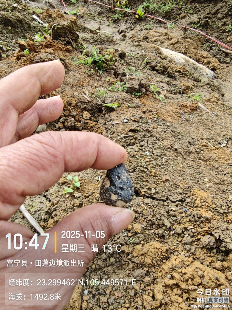 上午八点刚过,来自距田蓬街约13公里的木卓村的旧货摊主老张马上忙碌起来。上前一打听,他家里有不少从周边村寨所收的雷公墨——星宿石,但当天仅带来一个扁饼状的小样品。据他介绍,田蓬一带确实产有不少星宿石,这话也激发了我们在田蓬野外搜索的热情。尽管从11月1日起在文山州马关、富宁等地的数天考察走访中,已搜集到了仁和镇黄角树村、八寨镇倮者底村、田蓬镇龙哈村等多个村寨原产地雷公墨样品,它们均是当地老乡在村屯挖地耕作时一颗一颗收集的,在实地基本查清了滇南雷公墨的产地概况,但是一直未能亲身体验,在现场一手发现采集到雷公墨样品,掌握雷公墨的自然赋存状态、空间关系等信息,心有不甘。