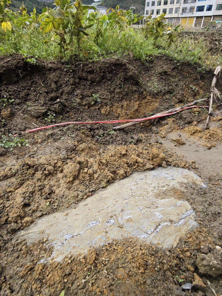 有新发现!经过两个多小时山上山下的搜索,一无所获,已是上午十点半过了,仍然执着前行。当搜索到边防派出所、天天幼儿园西北侧平坝时,何贤伟站长终于在刚开挖不久的水沟土堆中发现了雷公墨原产地身影!