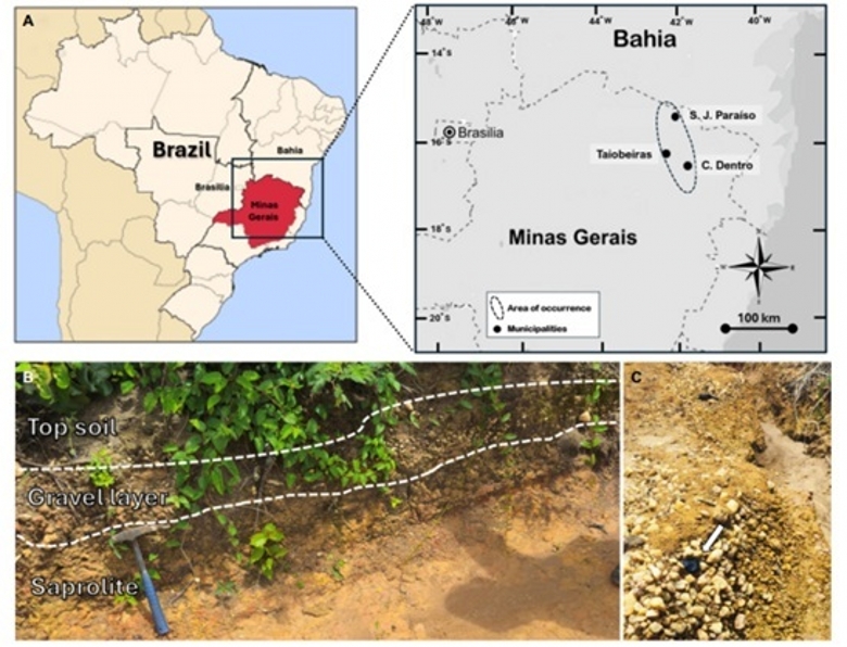 近年来,巴西米纳斯吉拉斯州北部地区的居民发现产于当地的一些天然玻璃样本。地质科学家Crósta、Silva、Ferrière等于2023年11月起对该地区进行了考察,在约90公里的距离内(图2)发现了10件样本。之后又于2025年1月进行再次考察,期间又发现了16件标本。同时还从与巴伊亚州接壤的米纳斯吉拉斯州的Taiobeiras、Curral de Dentro、São João do Paraíso市镇的当地居民处获得不少样品。截至2025年7月,已收集总计约500件标本,已命名为吉拉斯石(Geraisite)。经对居民的采访表明,这种玻璃已知在该地区广泛存在,尽管发现较为稀疏。