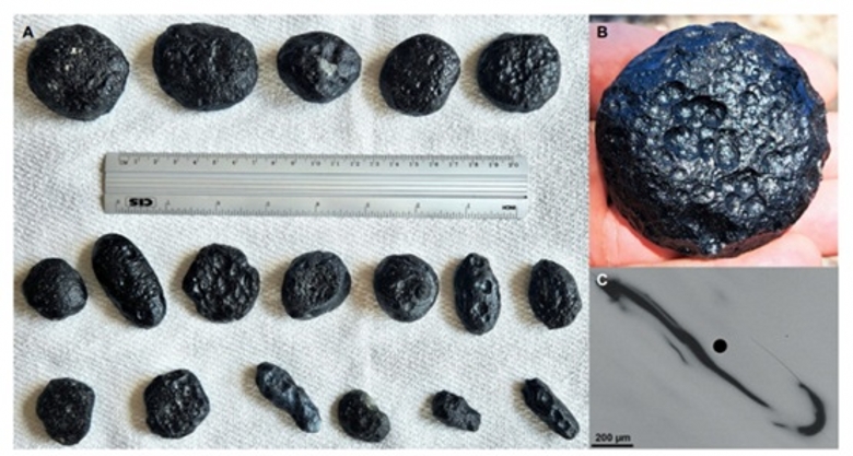 初步研究发现,所有标本都具有典型的玻璃陨石特征,质量从约1克到85.4克不等,尺寸从沿长轴最大约5厘米到小于1厘米,形状多样(球形、椭球形、泪滴形、盘状、哑铃形和扭曲形)(图3),均属典型的完全熔融飞溅形态玻璃陨石。未发现分层标本。它们呈黑色,除一件橄榄绿色标本外,表面都有特征的密集凹坑。在透射光下,它们呈现橄榄绿至棕色。根据包括宏观观察和水含量估计,支持其撞击成因。