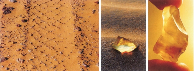 它们最初被称为“利比亚沙漠玻璃”(Libyan Desert Glass (LDG)),其SiO2含量为96. 5—99.0% 呈金丝雀黄色和黄绿色,接近透明。后经不断追索发现仅分布于埃及西部与利比亚交界的大沙海(Great Sand Sea)区域。