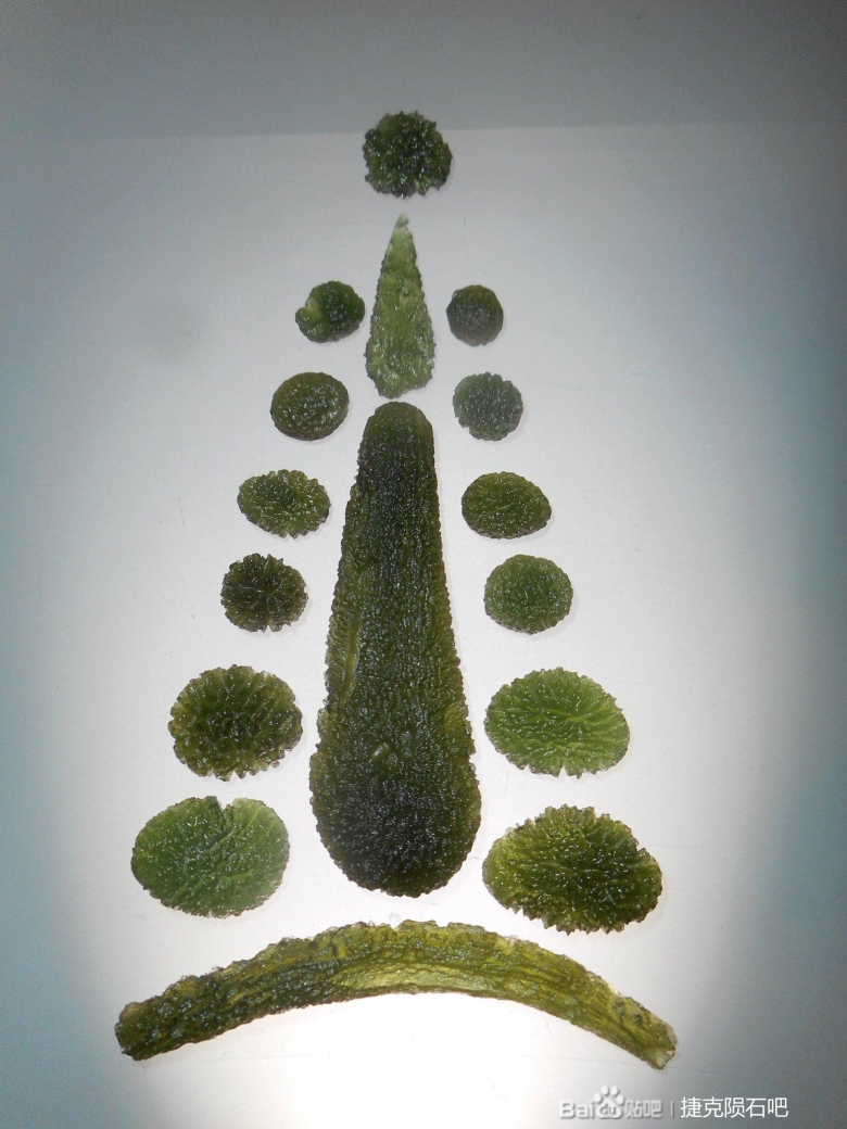 捷克陨石(Moldavite)属高硅质硅酸盐玻璃,主要成分为二氧化硅、三氧化二铝,含铁、锰等元素,含有微量的水、细小气泡;呈熔融状非晶质结构,一般呈浅绿色、翠绿色、橄榄绿色、墨绿色,通透性好,颜色亮丽,摩氏硬度5.5——6.5,是切磨性能良好的宝石佳品,有“跨越星空的绿色精灵”之誉。