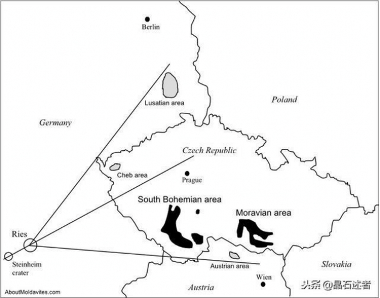 捷克陨石主要散布于捷克南部莫达维河流域的波西米亚、摩拉维亚,在布拉格南方、维也纳西北方也可见其踪影,一般埋藏于农田地地表的浅土层约1~5米的深处,通常在一立方米砂砾堆中,才能找到2—3片,相比其它地区数以百吨甚至亿吨计的黑色玻璃陨石,数量极为稀少,即使是和钻石、红蓝绿宝、翡翠的产量相比,也是非常珍稀。