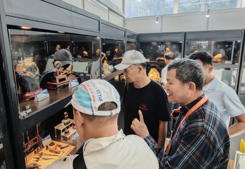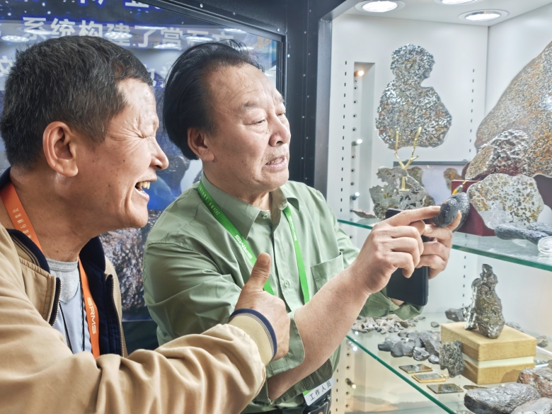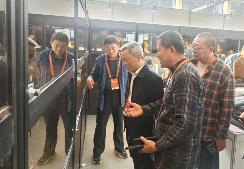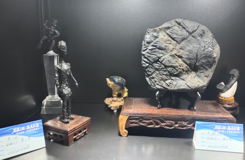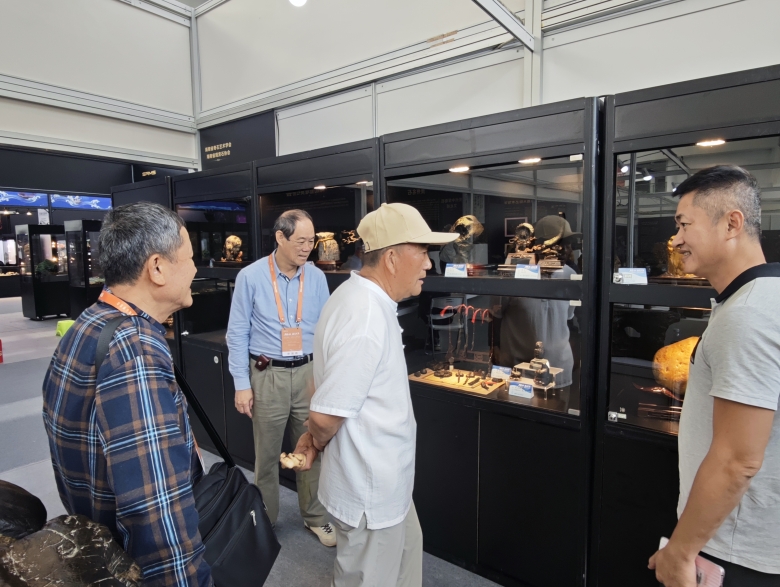 海南赏石艺术学会会长林少川、黑龙江赏石尤会长、华星耀陨石科普馆长杨安雄等参观雷公墨展品。