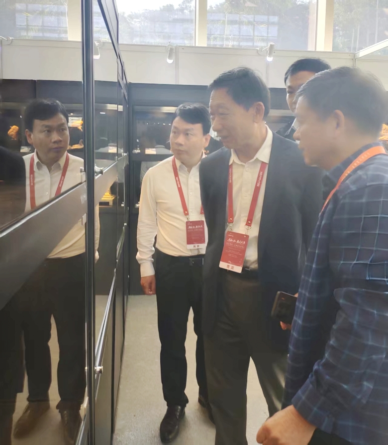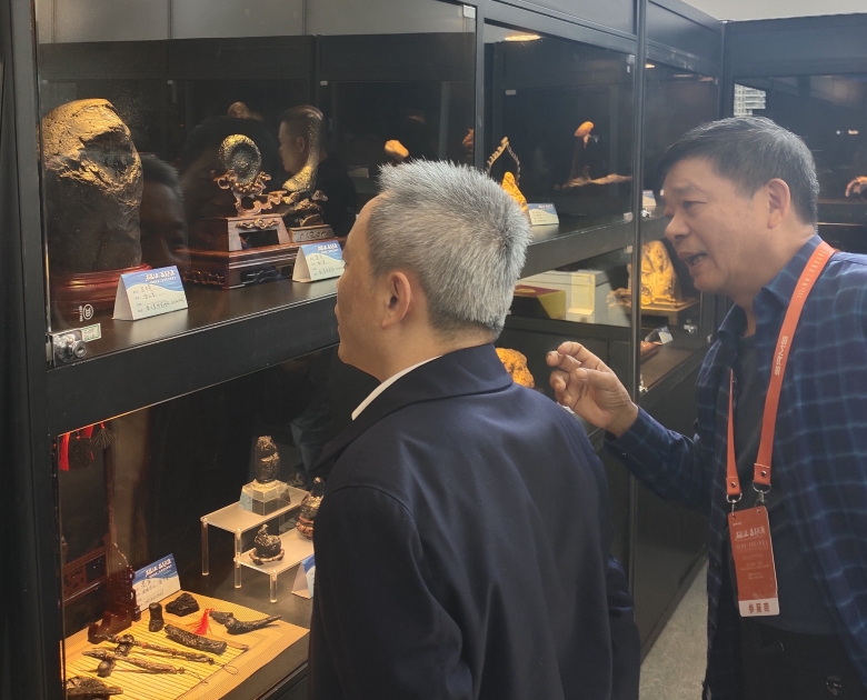 海南省自然资源和规划厅厅长贾文涛(左)参观指导雷公墨展品。