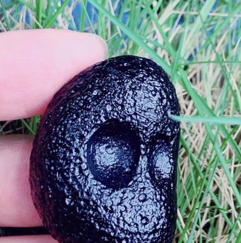 标本通体小气印,两个深陷的坑,似一双小眼窝,形成一张变形小脸,其属于大气泡外逸后所留下的印记。