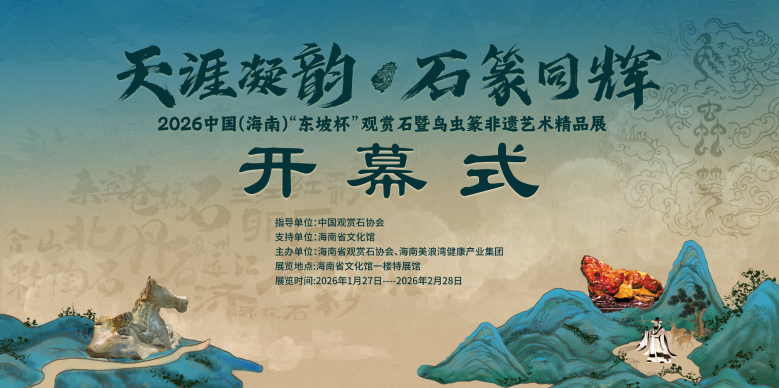天涯凝韵,石篆同辉。由中国观赏石协会指导、海南省文化馆支持,海南省观赏石协会及海南美浪湾健康产业集团联合主办,海南香石界文旅有限公司承办的2026中国(海南)“东坡杯”观赏石暨鸟虫篆非遗艺术精品展,于2026年1月27日在位于海口市琼山区的海南省文化馆省非物质文化遗产展示中心开幕。同时在滨江西路天艺酒店一楼开展观赏宝石工艺品商务展出。