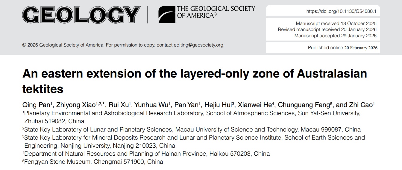 论文链接:Pan, Q., Xiao, Z., Xu, R., Wu, Y., Yan, P., Hui, H., He, X., Feng, C., Cao, Z., 2026. An eastern extension of the layered-only zone of Australasian tektites, Geologyhttps://doi.org/10.1130/G54080.1