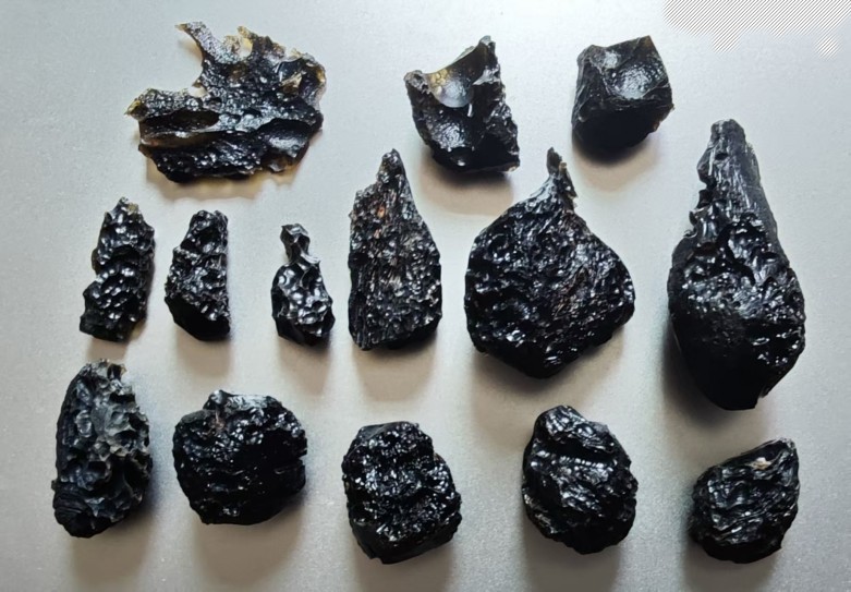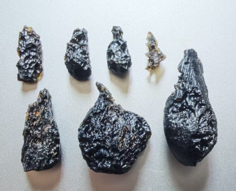 标本呈漆黑色,尖棱状边角,熔融致密型,最大的重量19.6克,小的不足1克。