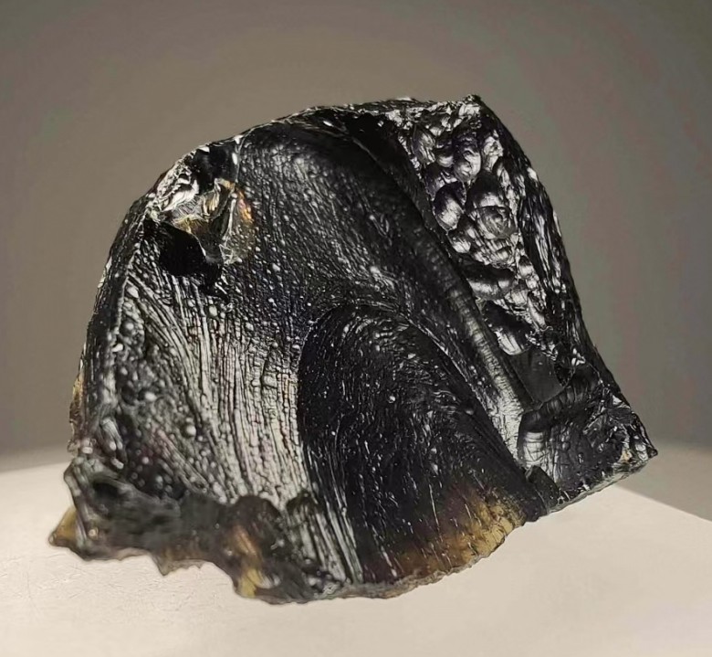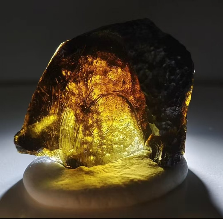 经测量,该标本规格约29*28*14mm,重量7.8克,属于袖珍形,原是空心球碎片,在断面及空腔内保留空气动力摩擦形成的流纹形斑纹,其中残留的空腔形状似指尖,其流纹似指纹状,标本单薄,透过强光呈现橄榄黄色。